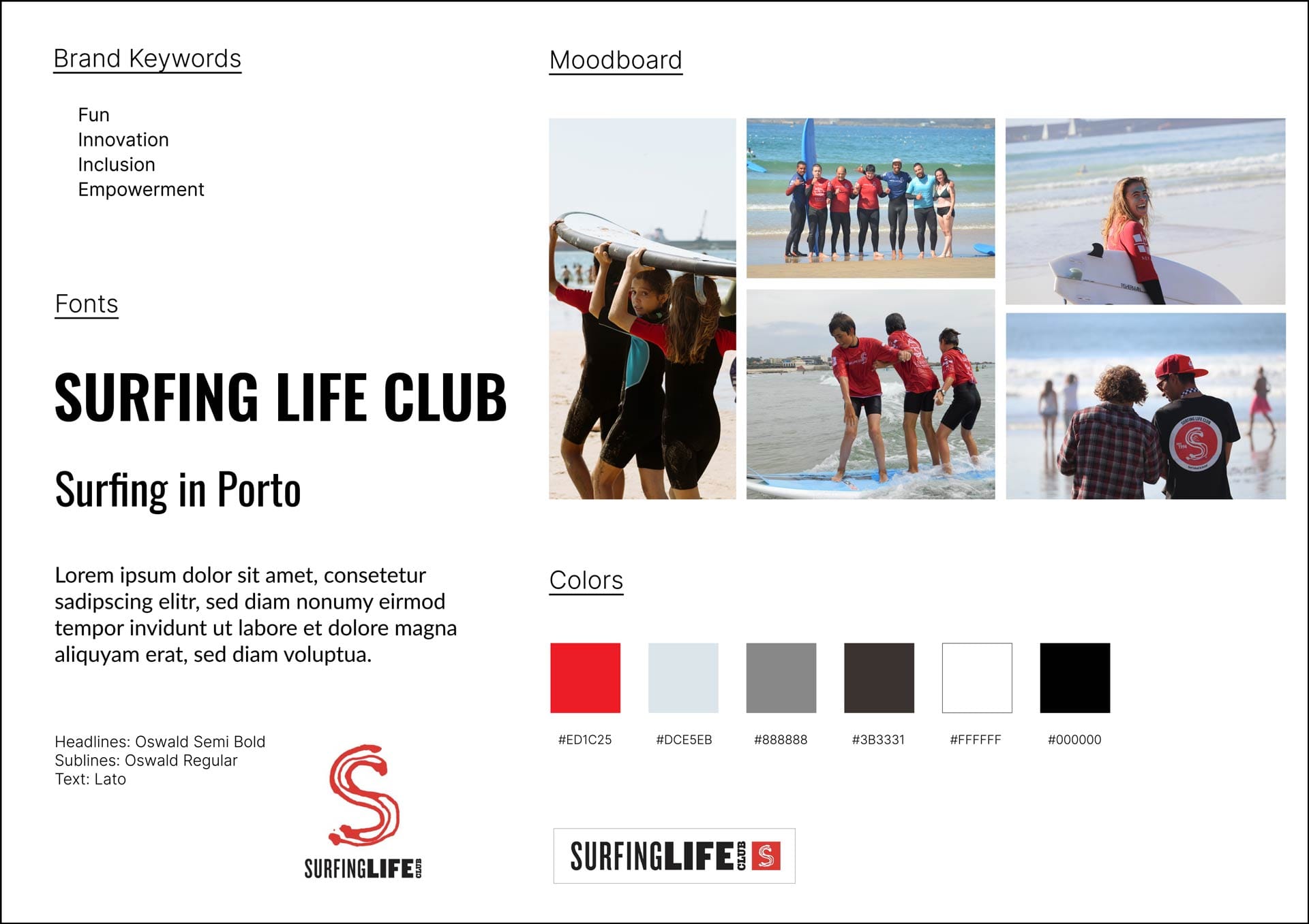 The Surfing Life Club brand design concept was adapted slightly for the website redesign. The bold red accent colour and the font style for the headings were kept. I added some softer colours to refine the design and ensured consistency in the use of colours and fonts.